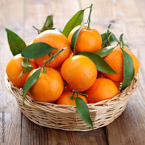Fresh Oranges in a Wicker Basket on a Wooden Table