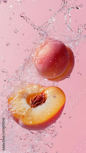 Fresh Peach Slice and Whole Fruit Splashing in Water on Light Pink Background