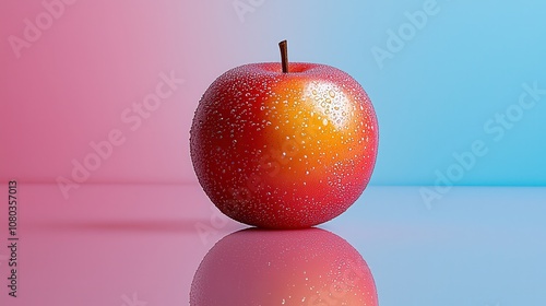 Fresh Red Apple with Water Droplets on a Reflective Surface Against a Soft Blue and Pink Gradient Background