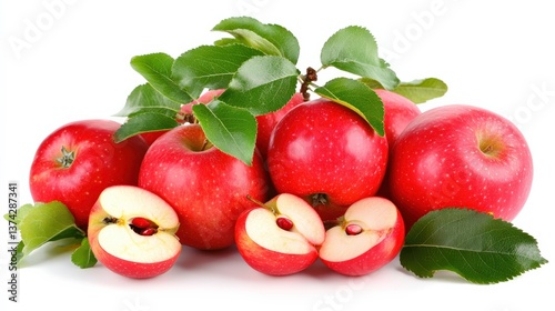 Fresh Red Apples with Leaves, Halved Apples Displayed on White Background, Perfect for Health and Nutrition Concepts in Food Photography