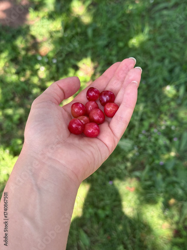 cherry, cherry, fruit, red berry, summer fruit, hand, holding, fresh, natural, harvest, healthy snack, organic, closeup, sunlight, shadow, summer, green background, garden, juicy, ripe, food, vegan, vegetarian, raw food, sweet, snack, healthy lifestyle, finger, natural light, minimalism, healthy eating, vitamin, nourishment, nature, freshness, delicious