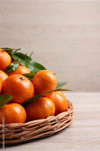 Fresh ripe juicy tangerines and green leaves on white wooden table, space for text