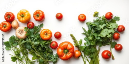 Fresh ripe vegetables and herbs arrangement from top view on white background, vibrant