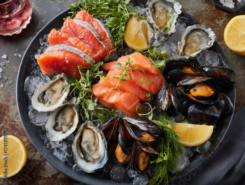 Fresh seafood platter with raw salmon, oysters, and mussels on ice