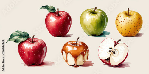 Fresh set of apples in red, green, and white, showcasing a healthy and organic collection of ripe, juicy fruits