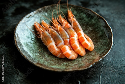 Fresh Shrimp on Ceramic Plate: Six succulent shrimp are elegantly arranged on a rustic ceramic plate, their vibrant orange hues contrasting beautifully against the dark, textured backdrop.
