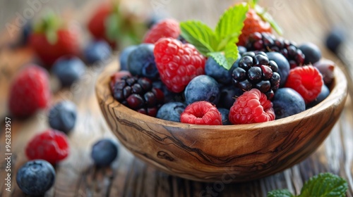 blueberry, raspberry, blackberry, strawberry, summer fruit, healthy eating, fresh fruit, fruit bowl, wooden bowl, healthy snack, fruit salad, dessert, breakfast, vitamin, antioxidant, natural food, rustic, tabletop, closeup, food photography, still life, colourful, bright, vibrant, healthy