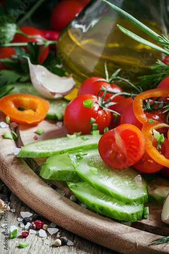 Fresh vegetables, chopped for salad, garlic, spices, herbs and o