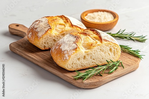 Freshly baked artisan bread on wooden board with rosemary, flour backdrop