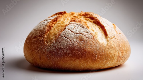 Freshly baked round loaf of artisan bread on light background