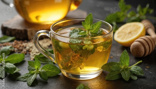 Freshly brewed herbal tea with lemon balm, mint leaves, honey in clear glass cup. Refreshing beverage promoting relaxation, well-being. Infused with natural ingredients for soothing aroma, healthy