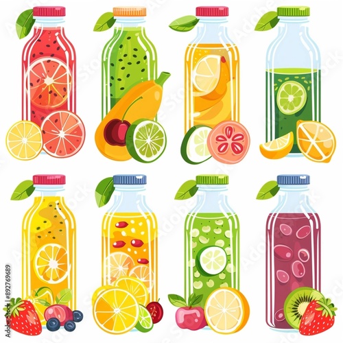 Freshly made smoothies and juices in bottles surrounded by colorful fruits and veggies
