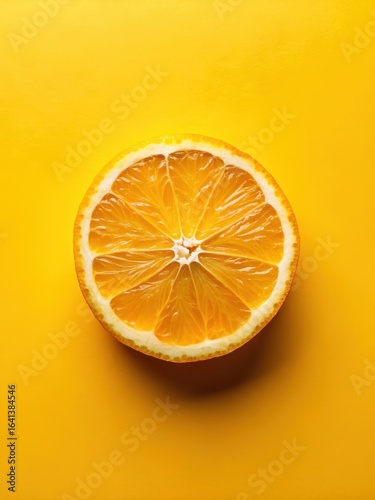 Freshly squeezed orange slice on a bright yellow background