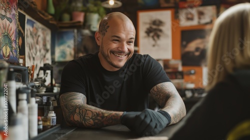 Friendly Tattoo Artist Conversing with Client in Artistic Studio Environment, Showing Tattoos, Creative Discussions, Design for Print, Card, Poster