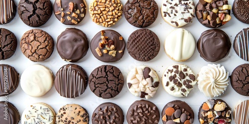 From above, on the white table, there are many biscuits modern vintage cakes arranged like a photo, in a minimalist style