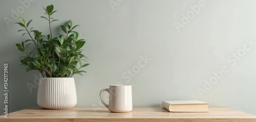 Front view of wooden desk with coffee mug and houseplant in pot. Workplace has space for work, copying. Modern interior has light wall, book near cup. Lifestyle studio photo.