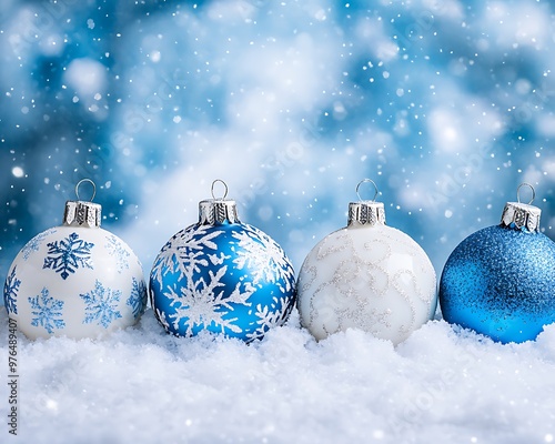 frosted, blue, white, holiday, bauble, arranged, scene, blank, area, top, messaging, or, branding