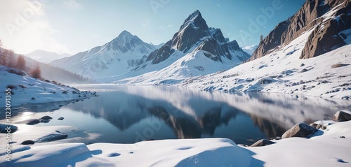 Frozen lake on the slopes of a snow-covered mountain, alpine landscape, serene lake, Colorado Rockies