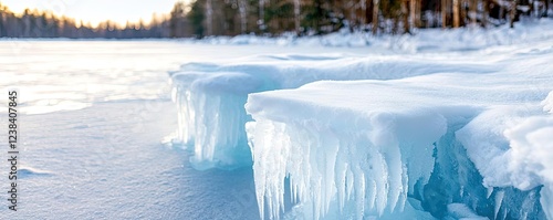 Frozen waterfall nature idea. Frozen landscape with icy formations by the serene lake under a clear winter sky.