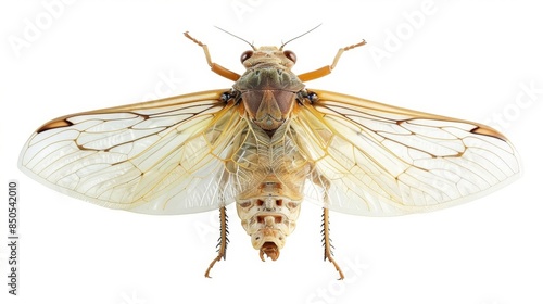Fulgorid planthopper insect displaying its delicate, translucent wings on a white background