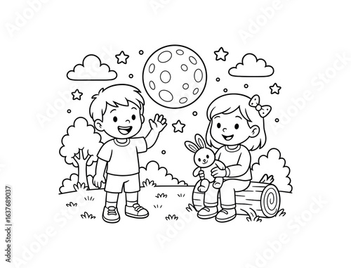 Full moon night stroke illustration cute kids coloring book style. Fun and wholesome theme made for children