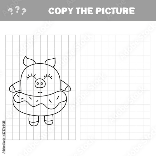 Funny pig with donut. Complete and copy the picture children drawing game