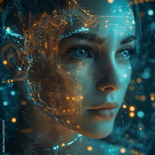 futuristic, ai, concept, female, cyborg, illuminated, brain, wire, circuit, technology, artificial intelligence, robot, science fiction, digital, advanced, background, woman, beauty, vision, dream, human, meditation, mystical