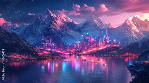 city, futuristic, mountain, snow, lake, night, light, neon, pink, purple, blue, vibrant, colourful, landscape, scenery, digital, art, illustration, fantasy, magical, dreamlike, winter, cold, serene, peaceful, majestic, grand, modern, technology, architecture, building, sky, star, cloud, water, boat, energy, power, glow, illumination, bright, dark, surreal, abstract