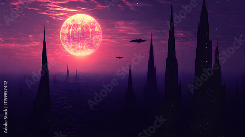 skyline, sunset, planet, glowing, spaceship, alien, science fiction, fantasy, technology, architecture, skyscraper, purple, pink, night, dark, mysterious, digital artwork, illustration, artwork, design, background, wallpaper, vibrant, cosmic, space, star, atmosphere, ambience, mood, setting, scene, view, perspective