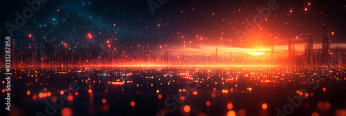 city landscape, futuristic, night, glowing, red light, building, skyscraper, skyline, technology, digital artwork, illustration, urban, modern, architecture, abstract, concept, background, design, science fiction, space, star, horizon, future, progress, innovation