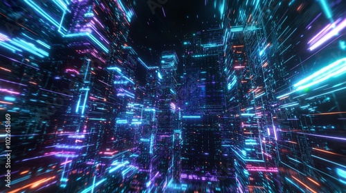 Futuristic Cityscape at Night with Neon Lights and Digital Network - Hyper Detailed 3D Rendering