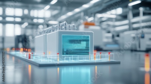 Futuristic industrial building with glowing elements and a sleek design, showcasing modern architecture in a bright factory setting.