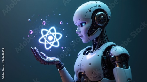 robot, futuristic, metallic, atom, symbol, glowing, science fiction, technology, artificial intelligence, cyborg, android, machine, digital, innovation, future, advanced, modern, metal, energy, light, power, science, engineering, mechanism, robotic, automation, illustration, artwork, graphic, image, fantasy