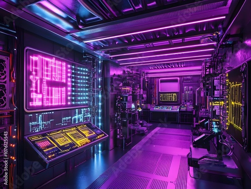 neon, futuristic, science fiction, technology, digital, abstract, colourful, dark, illumination, light, glowing, modern, industrial, interior, facility, equipment, control, interface, console, display, monitor, machine, engineering, innovation, energy, power, atmosphere, environment, surreal, advanced, high technology, laboratory, workspace, datum, information, system, network, code, circuit
