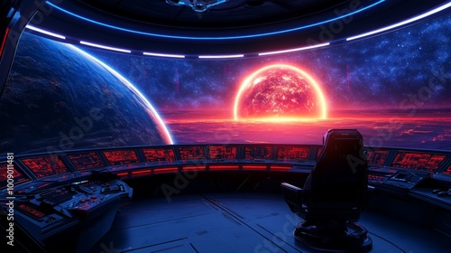 Futuristic Spaceship Cockpit with Red Giant and Earth View