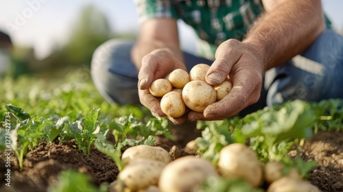 Gardening on a sunny day while planting organic potatoes in the field
