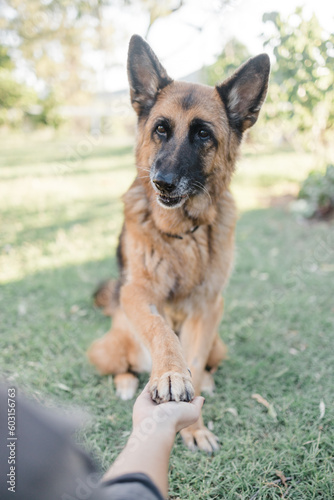 animal, canino, dog, elderly, german shepherd dog, hand, obedience, obedient, old, paw, pet, shake, trained, trick