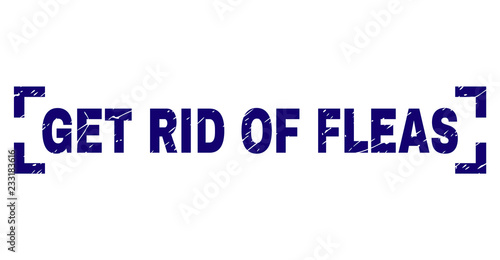 GET RID OF FLEAS text seal print with grunge texture. Text tag is placed inside corners. Blue vector rubber print of GET RID OF FLEAS with dirty texture.