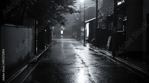 Ghostly Solitude on a Rainy Street - Moody Black and White Urban Scene of Deserted Cityscape in Heavy Rainfall