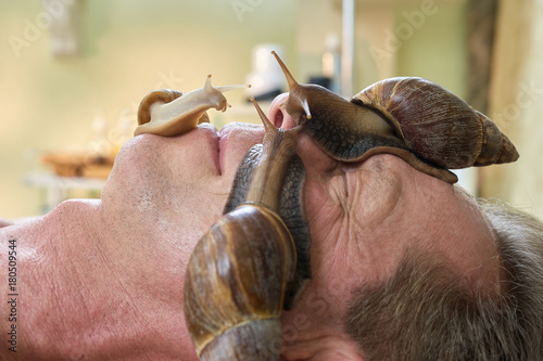 Giant snails on mature man face. Modern rejuvenating and moisturization cosmetological procedure with snails in beauty salon. Relaxation and skin care.