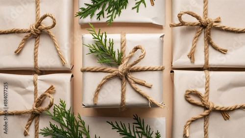 Gift boxes packed with craft paper with spruce branches. Winter and Christmas background. AI generative.