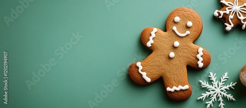 Gingerbread cookie with decorative icing and snowflake shapes on a green background with Copy Space for text placement