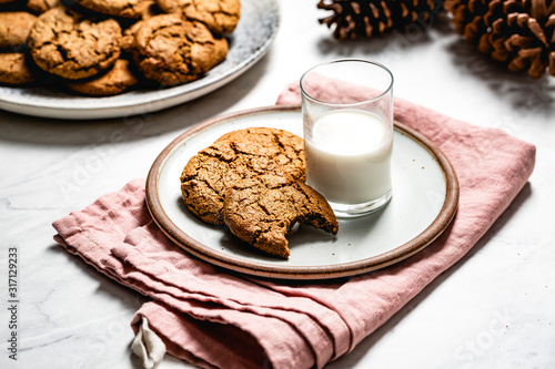 biscuit, cookie, biscuit, cake, drink, food, front view, gingerbread, glasses, milk, napkin, plate
