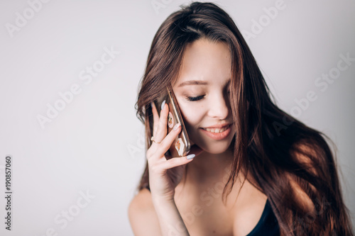 Girl calling on phone. Beautiful woman uses a smartphone