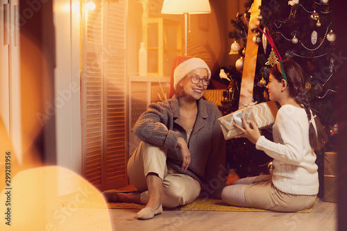 Girl giving Christmas gift box to her happy mother and congratulating her with Christmas while they sitting on the floor near the Christmas tree