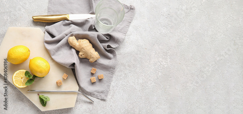 Glass, cutting board and knife with fresh ingredients for lemonade on grunge background with space for text