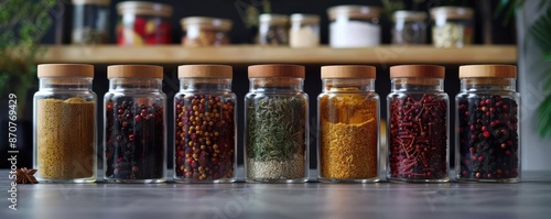 Glass jars with exotic oriental spices on sleek gray background, high detail, vibrant colors, realistic style, 4k resolution, dynamic lighting