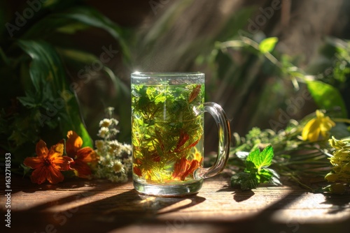 Glass mug of herbal tea, surrounded by flowers and plants in sunlight