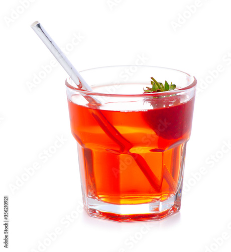Glass of red compote juice with strawberry, cocktail straw on white background isolation