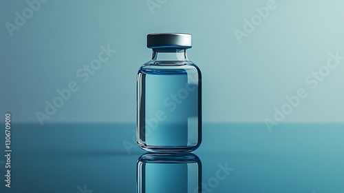glass vial medical vaccine bottle transparent liquid sterile metallic cap reflective surface clean minimalist background healthcare science pharmaceutical photography with soft blue tones